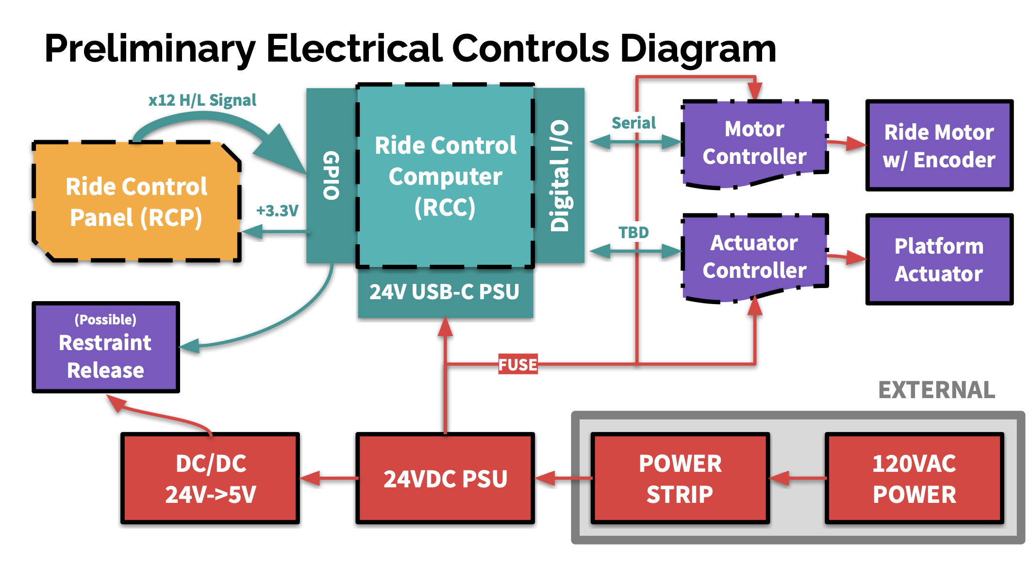 I also engineered and documented the ride’s electrical system in KiCad, including a redundant hard-wired E-Stop and detailed schematics for wiring, power distribution, and interfaces to support design reviews and troubleshooting.